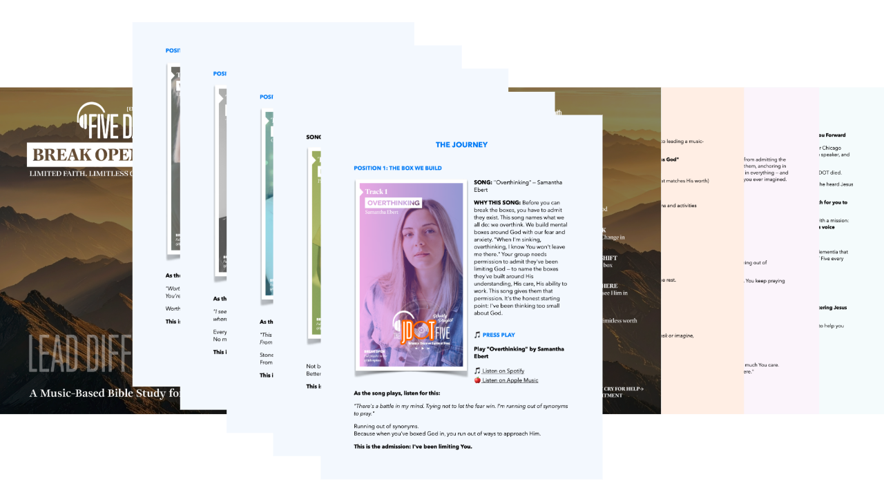 FIVE DAYS with The JDOT Five (Essentials) is the complete curriculum guide that shows you exactly how to turn this week's playlist into a transformational group experience.