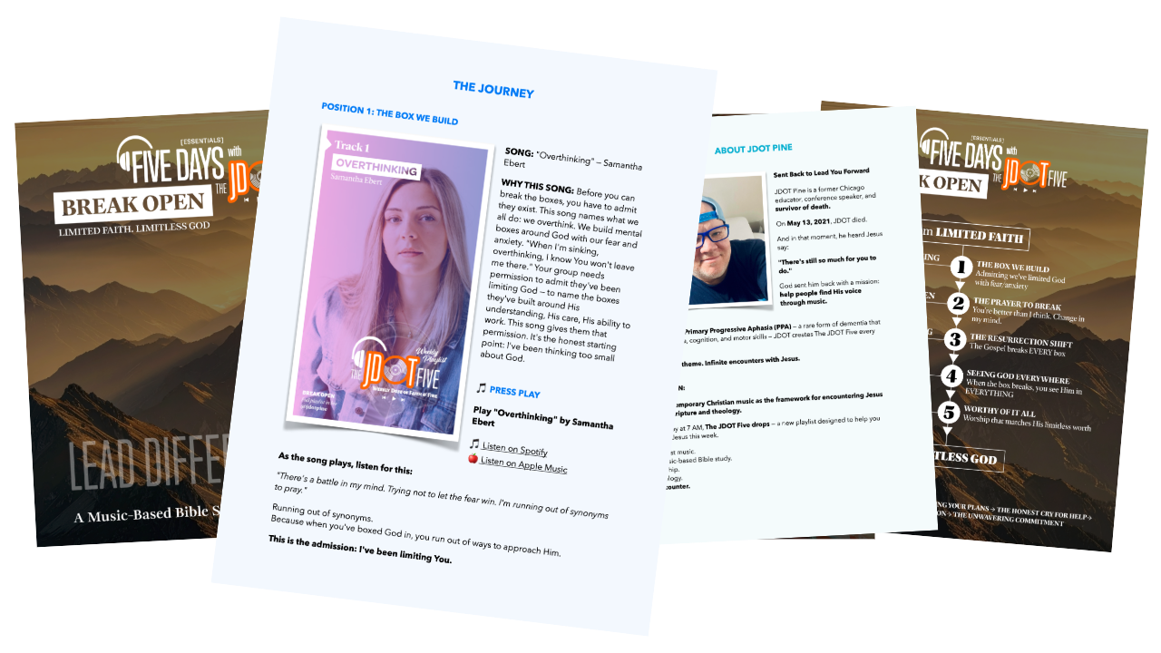 📘 Complete BREAK OPEN Essentials Guide (100+ pages) → Full theological foundation and arc breakdown → JDOT's personal story with this theme (PPA, NDE, building boxes while experiencing faithfulness) → Position-by-position song analysis for all 5 songs → How to use the arc with your group (4 implementation options)