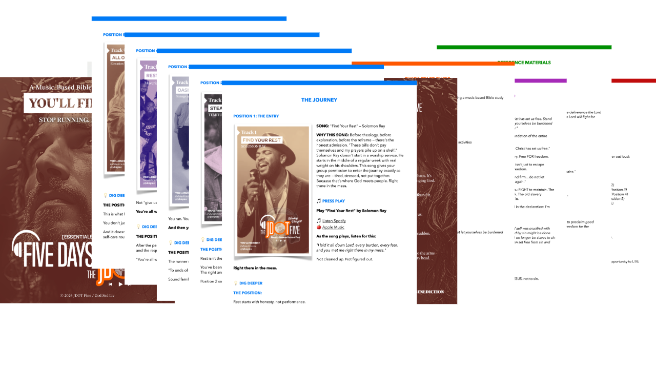 📘 Complete YOU'LL FIND REST Essentials Guide (50+ pages) → Full theological foundation and arc breakdown → JDOT's personal story with this theme (the ten months, the fear, Mancelona, the "yet," the baseball diamond, the peace) → Position-by-position song analysis for all 6 songs → How to use the arc with your group (4 implementation options)